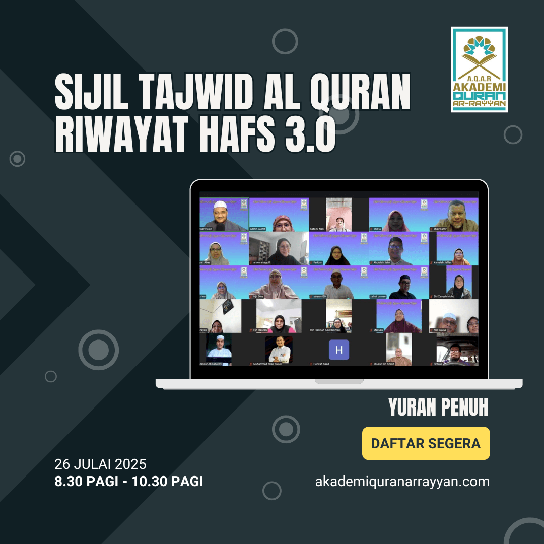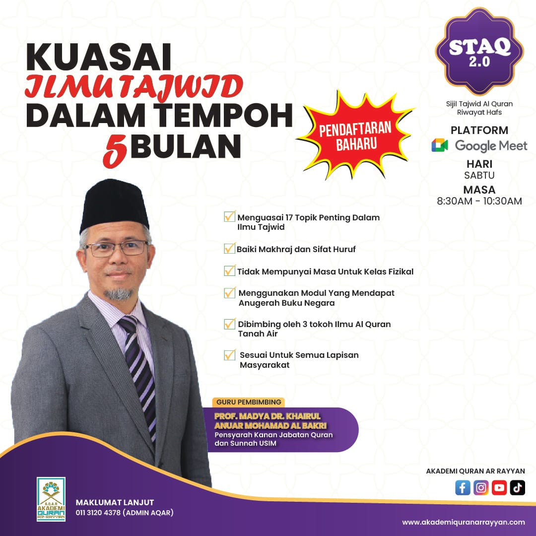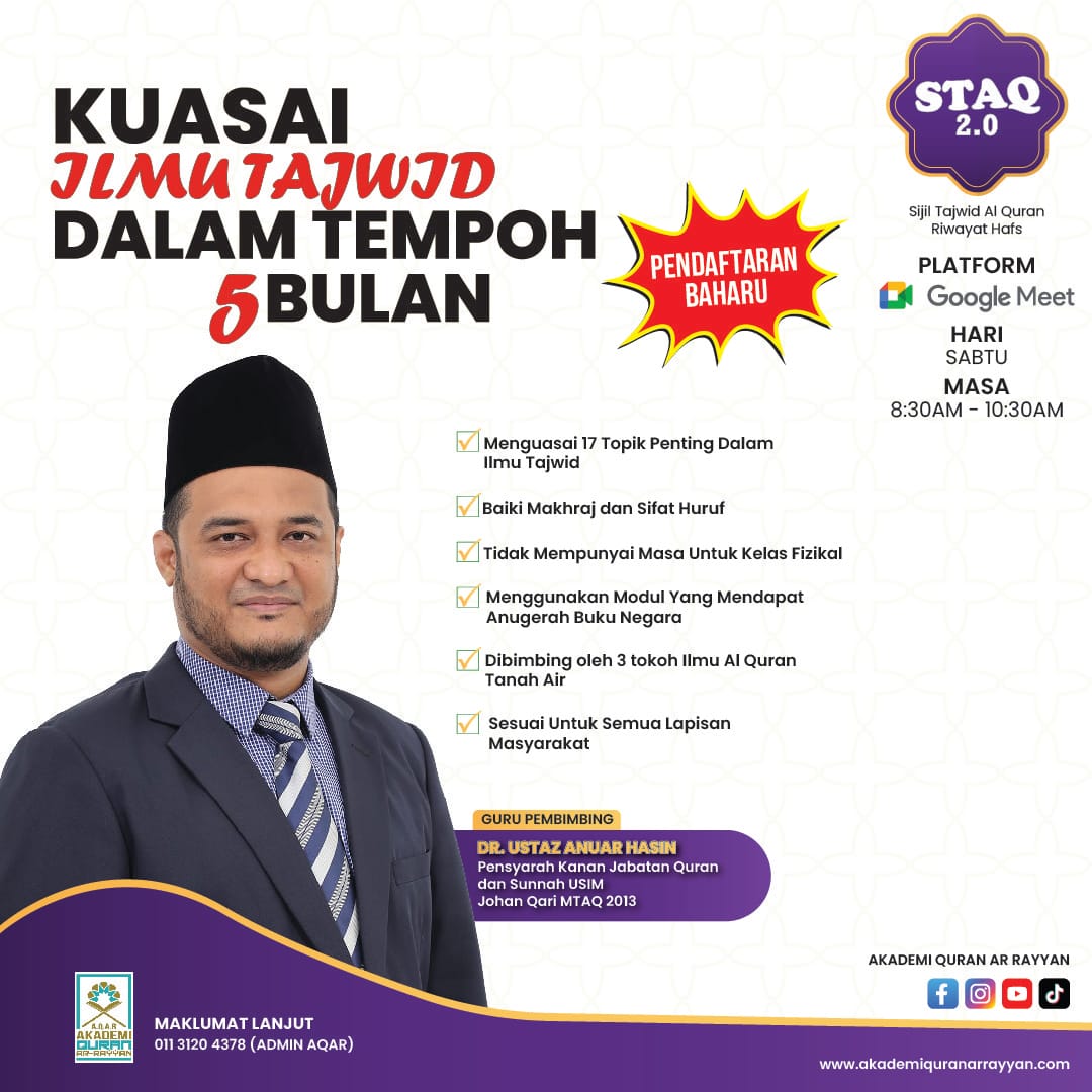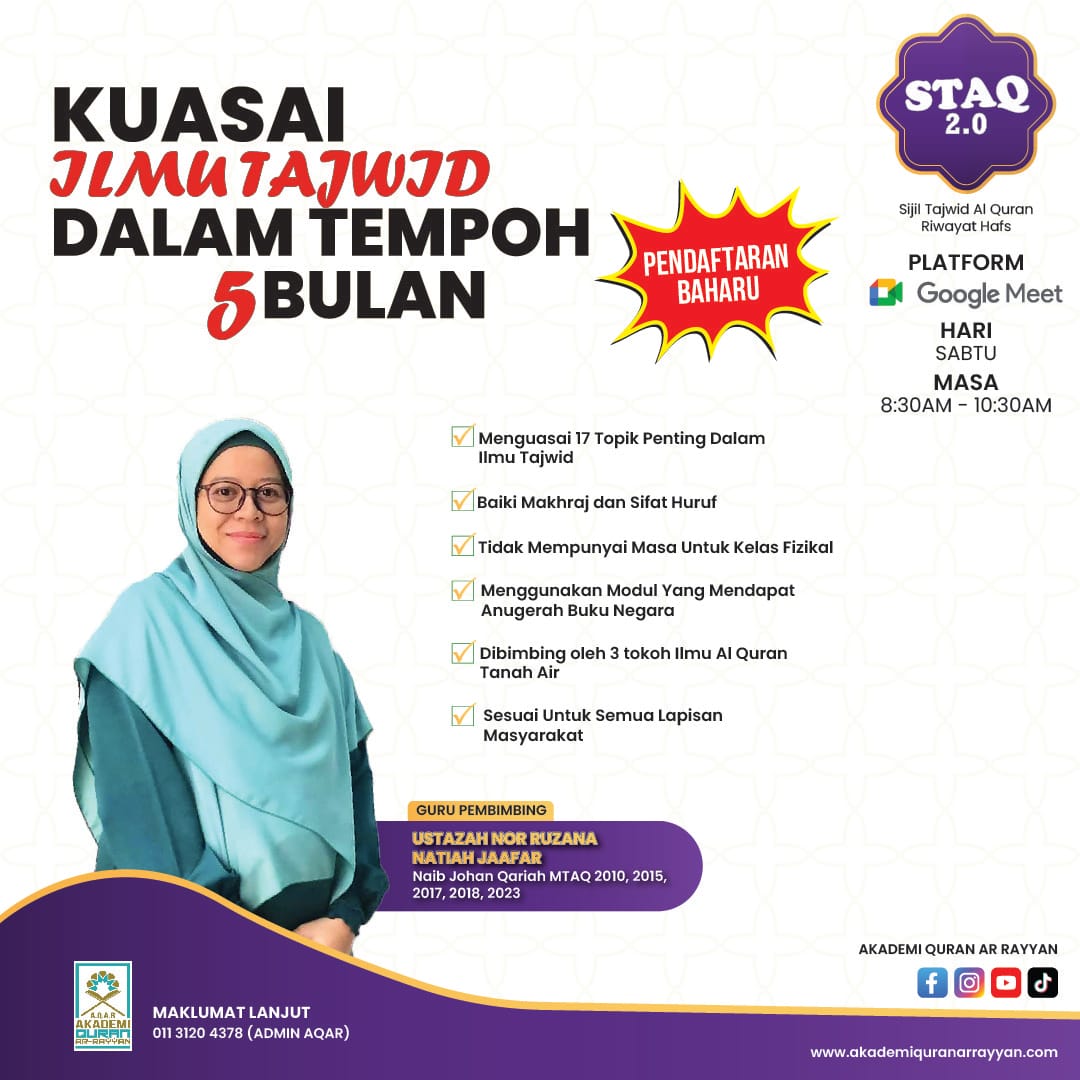 Masukkan Kod “STAQ20” Untuk Mendapatkan Diskaun RM20 Bayaran Penuh Sijil Pengajian Tajwid Al-Quran Riwayat Hafs 3.0. Kelas akan bermula pada 7 Julai 2025.